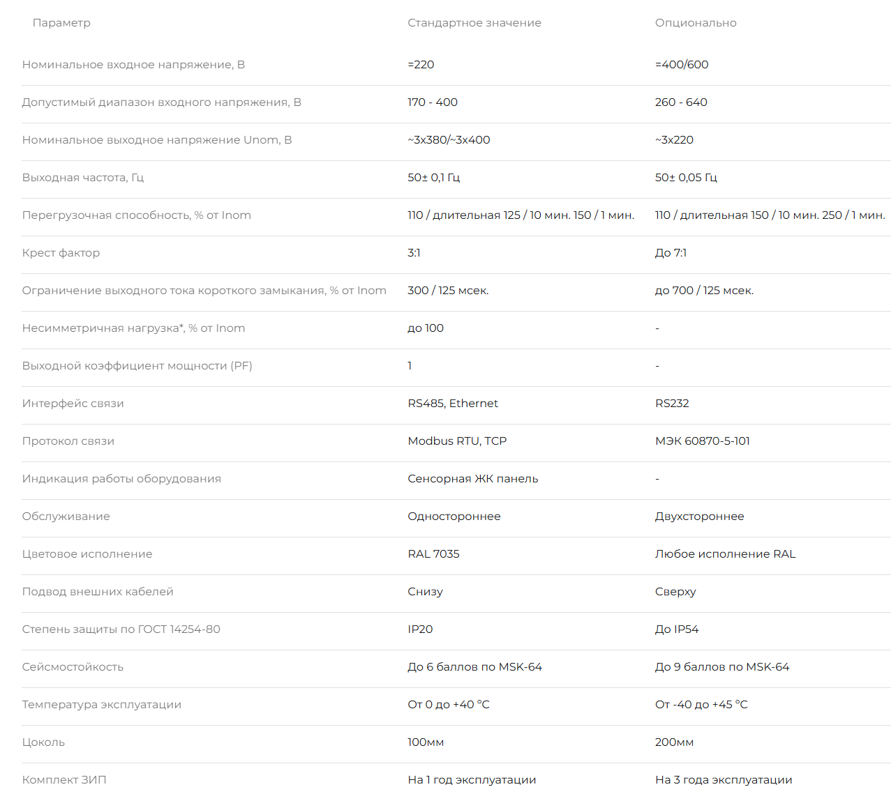 Инверторы напряжения СБПМ-ИН могут быть оснащены следующими опциями: